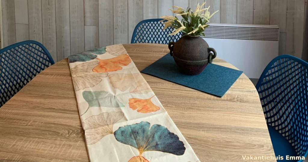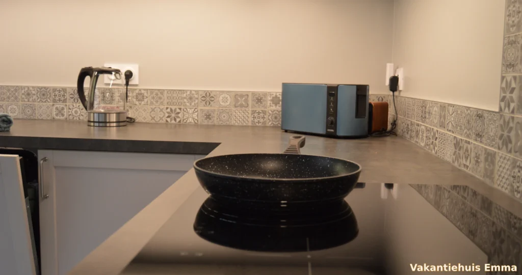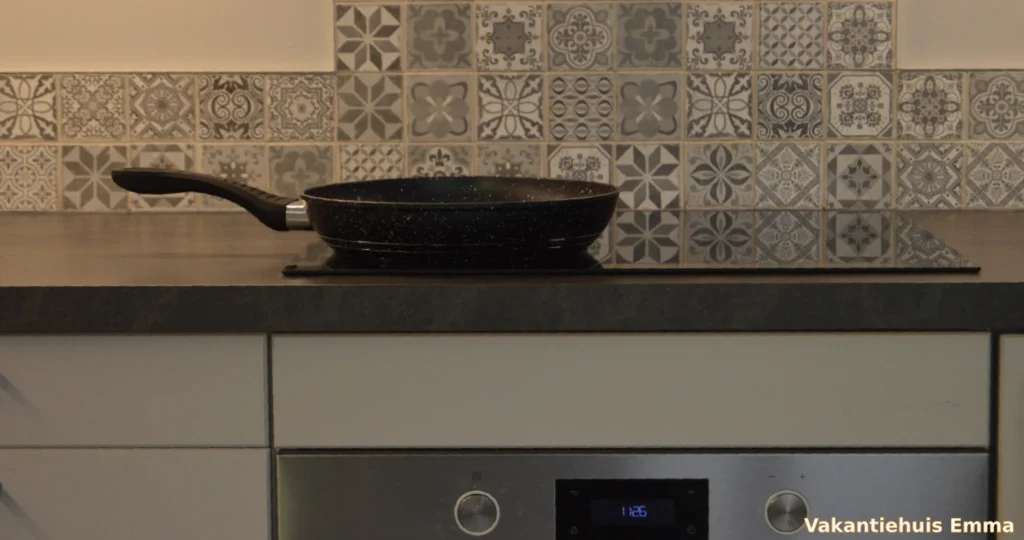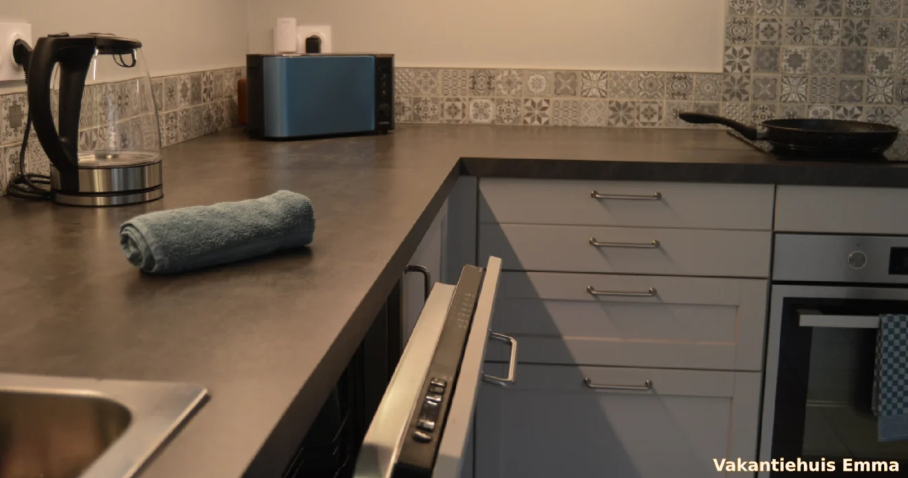 De keuken is volledig uitgerust en biedt alles wat je nodig hebt voor een comfortabel verblijf. Er is een oven, koelkast en een volledige set potten, pannen, borden en bestek aanwezig. Deze moderne ruimte is ontworpen om koken gemakkelijk en aangenaam te maken, met alle benodigde voorzieningen binnen handbereik. Daarnaast is er een ruime eettafel voor vijf personen, perfect voor gezamenlijke maaltijden. De keuken combineert functionaliteit met een huiselijke sfeer, waardoor het een ideale plek is om te koken en te genieten van heerlijke gerechten in een gezellige setting.